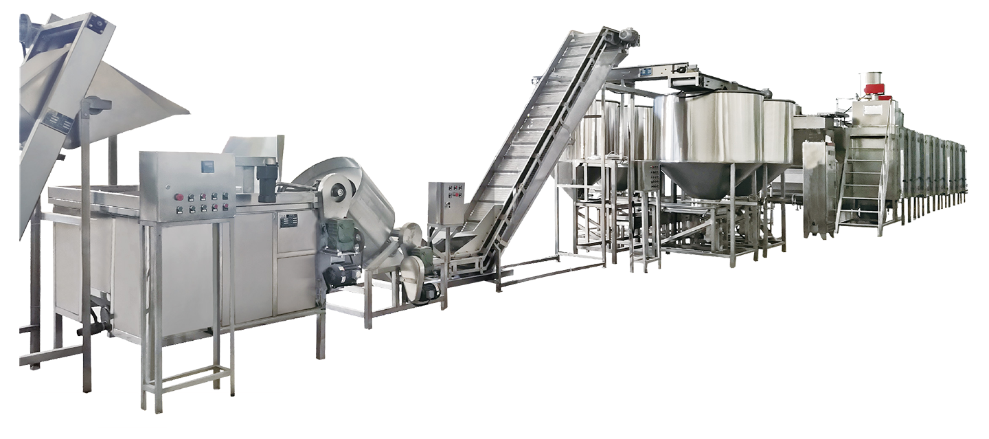該生產線用於五(wǔ)香花生米的生產加工(gōng)。從花生米的漂燙、拌料入味至烘烤包裝,實現自動化(huà)生產(chǎn),生產的產(chǎn)品具有質(zhì)地均勻,以及無掉皮(pí)變色等優點。